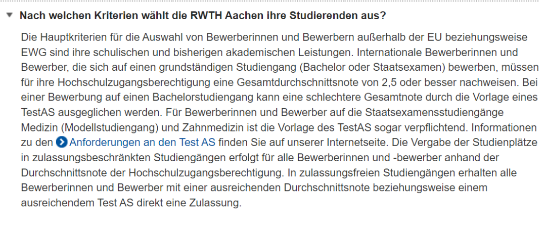但要注意,亚琛工业大学针对本科申请人的一个重要条件是,申请人的均分(HZB-Note)必须至少达到2,5(80%);如果均分不够,也可以通过TestAS成绩来弥补。
