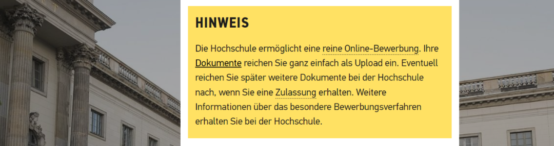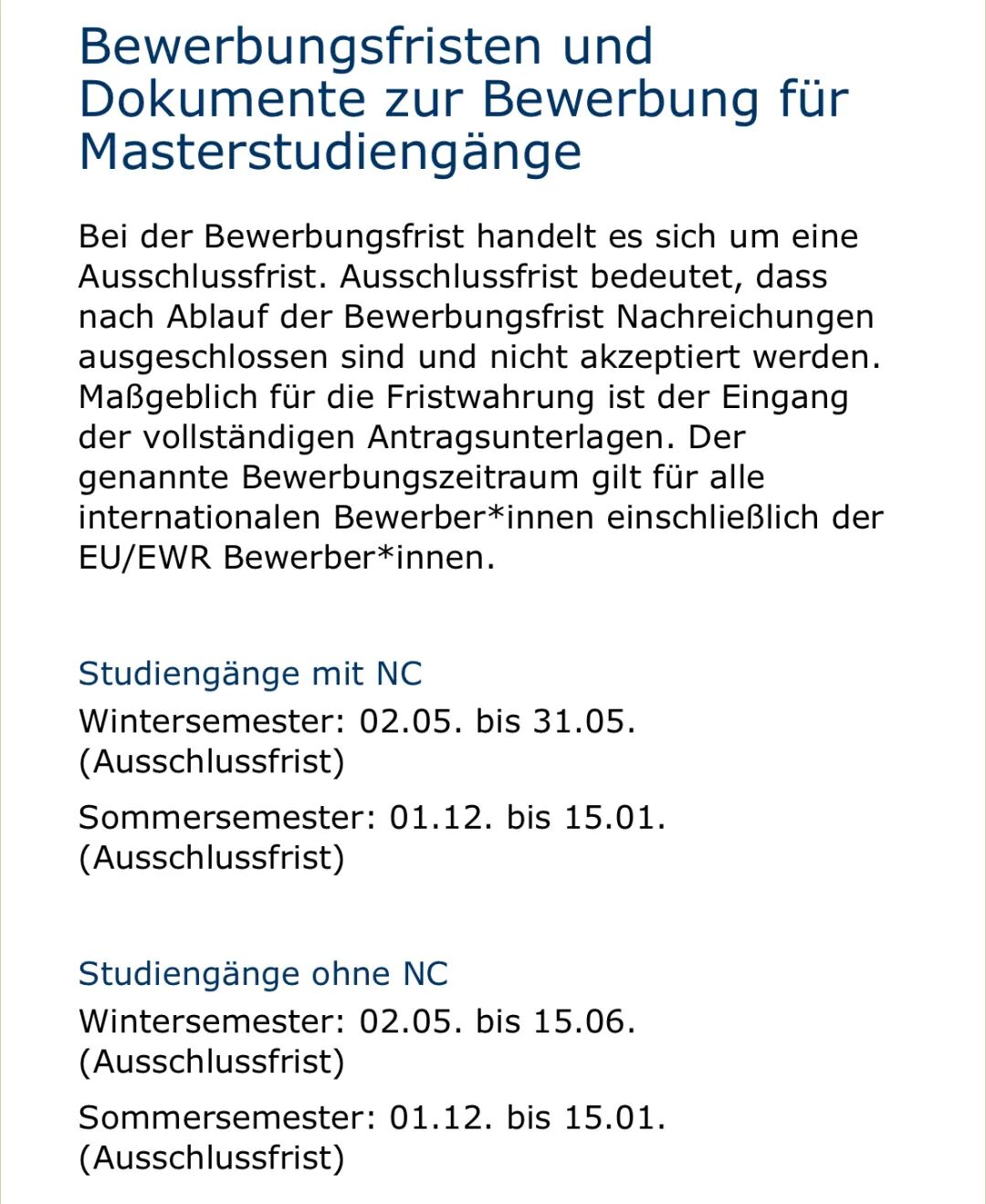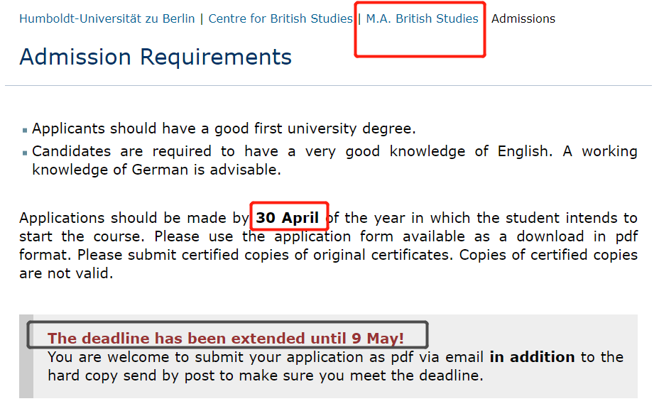如何申请柏林洪堡大学?(2024年最新申请信息)作者: ZU / 2025年11月13日 柏林洪堡大学的前身是弗里德里希-威廉-柏林大学(Friedrich-Wilhelms-Universität zu Berlin),学校创建于1809年,于1810年正式开学。 学校的基本信息 创建时间:1809年 学生总人数:34304(不包括夏利特医学院的学生人数) 留学生人数:5211(15%) 2025QS排名:世界#120,德国#7 2025THE排名:世界#84,德国#4 柏林洪堡大学主楼 申请柏林洪堡大学 我将在下方根据柏林洪堡大学官网最新内容为大家汇总一些申请该校的重要信息。 申请方式 留学生通常都要通过uni-assist申请柏林洪堡大学,不过也有例外,比如个别英语授课的硕士专业就不通过uni-assist申请,而是直接通过院系的网申系统完成。 目前通过uni-assist申请柏林洪堡大学仍然不要求邮寄纸质材料,你只需要完成网申、交申请费,以及上传申请材料即可。 申请时间 柏林洪堡大学硕士专业冬季学期的申请截止日期相对较早。受限硕士专业是5月31日截止,非受限硕士是6月15日截止。 夏季学期则跟大多数学校一样是1月15号截止申请。 需要注意的是,个别英语授课的硕士专业与这里的截止日期有所不同,通常截止更早,比如3、4月份就截止申请了。建议申请英授课程的同学要提前了解申请时间。 例如Britsh Studies硕士(英授)一般在4月底截止申请 本科专业的申请截止日期没有特殊情况,也就是冬季学期7月15号截止,夏季学期1月15号截止。 语言要求 柏林洪堡大学的所有本科专业、国家考试专业(Staatsexamen)都是德语授课的,你可以通过DSH考试、德福考试等来证明你的语言能力。入学时可以提交以下任意一种德语证明(针对德语授课专业): 注意Telc C1 HS要求分数达到“gut” 如果计划入学前参加DSH考试,根据学校的要求,你在申请时必须具备至少C1的水平。学校认可的C1证书有德福4个3,或其他C1级别证书(语言班的C1证书是否能被认可建议咨询学校)。注意,语言班在读证明或学时证明不能用于申请DSH条件录取。 申请预科的语言要求:申请时至少具备Mittelstufe-II,例如DSH1、德福4个3、B2语言班结业证明等。参加W-Kurs则还额外要求B1英语证明(在申请时就要提交)。 注意,柏林洪堡大学没有针对留学生的预备德语课。 可同时申请的专业数量 柏林洪堡大学规定,所有来自非欧盟的申请人,在申请本科以及硕士专业时,只允许同时申请一个受限专业,以及一个非受限专业。 学习位置 柏林洪堡大学对于来自非欧盟的学生预留了5%的本科学习位置(注意仅针对本科和Staatsexamen专业);学习位置将根据学生的均分来进行分发(例如国内本科期间的均分、高考、高中会考的分数)。 硕士专业的学习位置比例并没有做说明,这种情况下一般就说明没有明确的比例规定,只要符合入学要求,院系则会视当季的申请情况来综合考虑录取与否。 录取结果时间 冬季学期 WS 硕士(NC):7月中旬 硕士(frei):7月底 本科(NC):8月中旬 本科(frei:8月底 注意,个别截止很早的英授专业,一般在5/6月份就会出申请结果。另外,这里是学校给出的参考时间,由于每个人的申请情况不同,所以出结果的时间也会有所不同,但基本不会差太多。 /发现更多/ 全面了解 | 在柏林洪堡大学可以学习哪些专业? 我如何帮助她申请到了柏林洪堡大学?