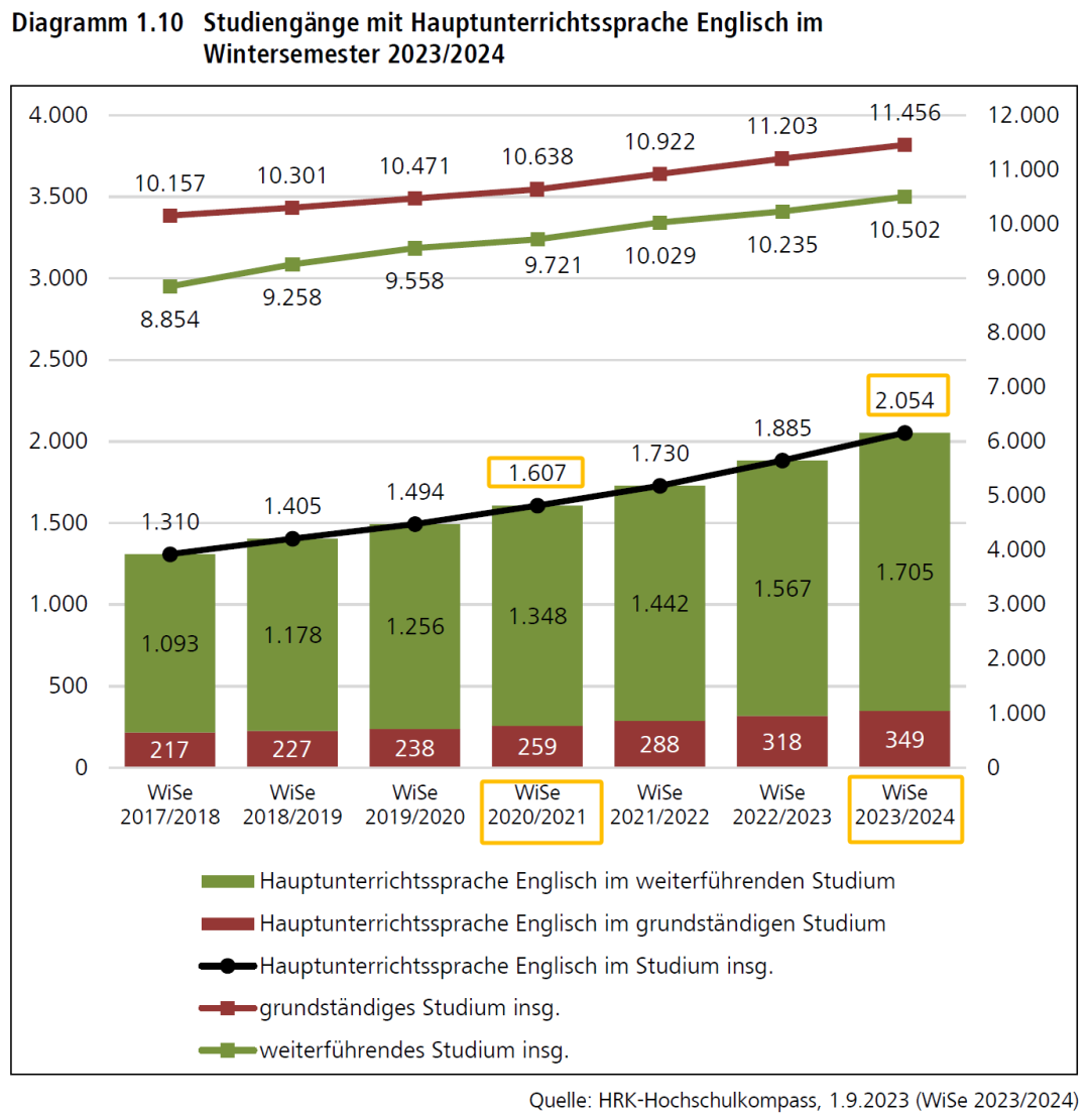 德国大学开设的以英语为授课语言的专业越来越多,尤其是硕士。2021年冬季学期的英授专业总数量为1730个,2023年冬季学期增加到了2054个。
