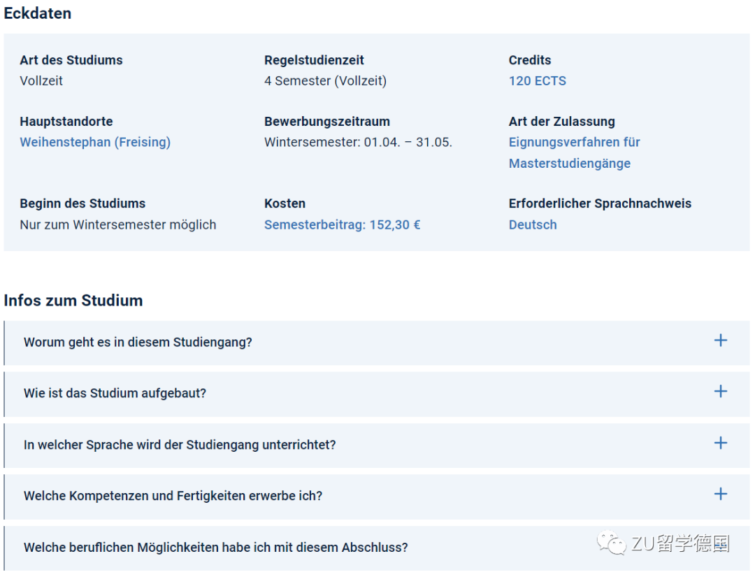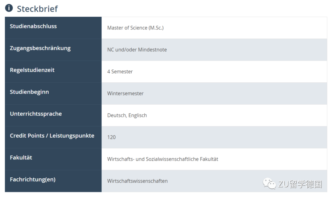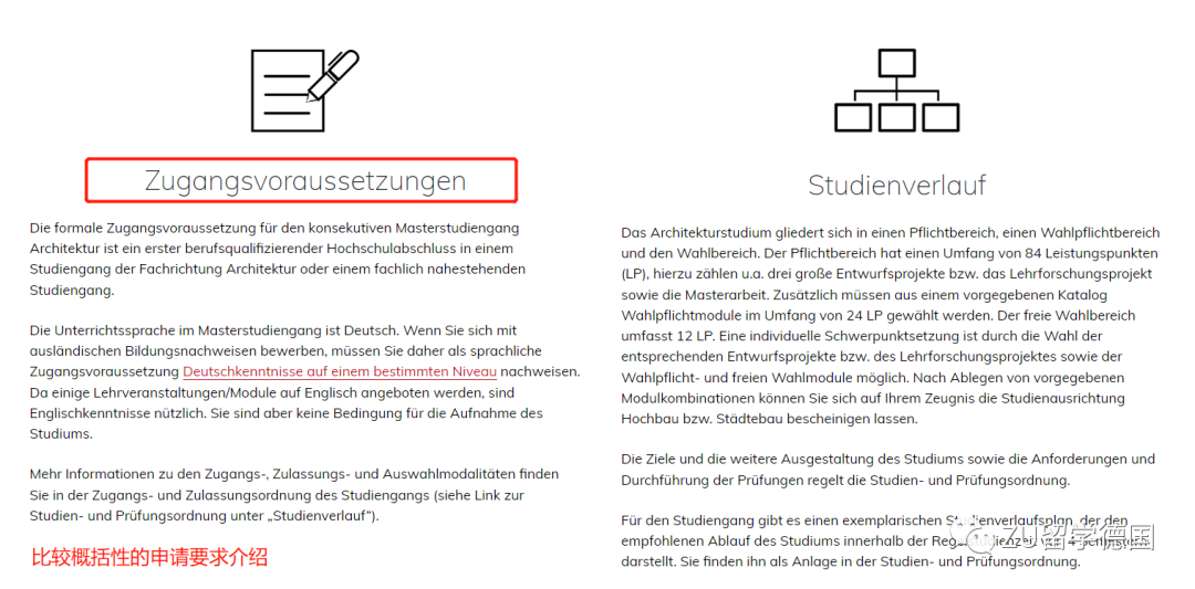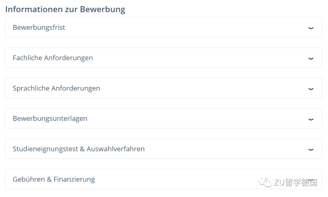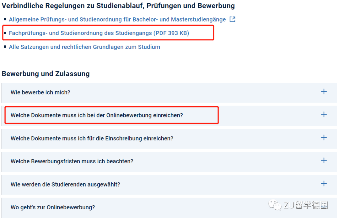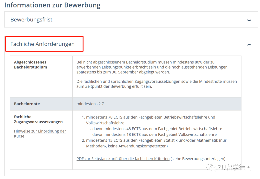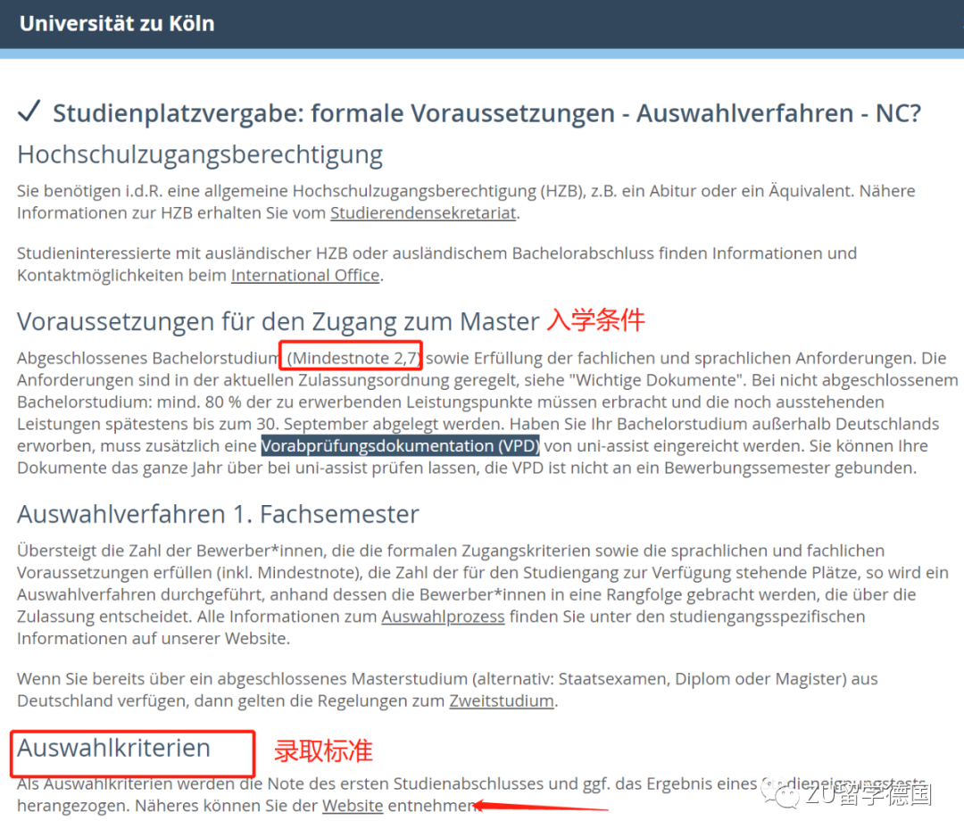 怎么查询德国大学的申请要求?主要有这两种方式作者: ZU / 2025年11月13日 申请德国大学需要查询的申请信息通常包括: 01) 具体的录取要求(均分/匹配度/语言要求) 02) 申请流程方面的信息(申请时间/申请方式/申请材料要求等) 如何相对快速地在学校官网找到这些信息?我将在下方给大家一些建议。 由于每所学校的官网设置都有所不同,所以在查询不同学校,甚至是同一所学校的不同专业时也会发现一些区别,但总体来讲,可以通过以下两种方式找到重要的信息: 🔍方式一: 从学校官网的”Studium/Studieren“找到Studienangebote/Studiengänge选项,随后找到你要申请的专业,点击进入相关页面,在该页面上你可以看到一些比较概括化的信息: 入学学期,学制,授课语言,录取类型(位置受限/非受限/其他),或者还有基本的申请步骤介绍。 慕尼黑大学专业查询页面 有一些学校的专业介绍页面包含了十分详细的内容,例如慕尼黑工业大学:除了有关于专业介绍的基本信息,还包括了申请材料要求,以及在页面可以直接查看专业的录取要求条例文档,从而了解这个专业详细的录取要求。 慕尼黑工业大学专业介绍页面 🔍方式二:在院系的官网查询具体信息 某些专业的详细录取要求可能没有直接展示在学校的专业介绍页面,也就是当你通过上面提到的通过Studienangebot进入到你想要申请的专业的介绍页面后,你可能只能看到一些基本信息,但具体的申请流程或详细的录取要求却看不到,例如柏林工业大学: 柏林工业大学专业的介绍页面:通常只包含基本的信息 这个时候,你就需要在院系的页面或者学校关于申请介绍的页面进一步查看相关信息。 💡💡💡💡 举例:如何在官网查看申请信息? 这里以科隆大学的企业管理硕士(Business Administration)专业为例,为大家展示如何在学校官网以及院系的页面查询该专业详细的录取要求和申请信息。 01)通过学校主页进行初步了解 按照上面提到的方式一,先找到专业的介绍页面:选择Studium&Lehre – Studieninteressierte,进入该页面后可以看到“Studienangebot”选项,点击进入。 进入到专业查询页面(Studienangebot)后,可以通过不同的选项进行筛选:通过专业名称首字母或学位筛选,也可以直接在“Suchbegriff“处输入专业名称(德语/英语,*如果查看的是德语官网页面,建议用德语输入;但如果申请的专业本身就是英文名称,那么就需要输入英文)。 科隆大学专业列表搜索页面 这里以Business Administration – Accounting and Taxation MA为例。在这个专业的介绍页面,你可以了解到一些基本信息,例如学位类型,学习位置是否受限,授课语言,入学学期,所属院系等。 除此之外,你也可以通过该页面(下图)了解到一些基本的录取要求,例如均分要求,VPD要求;但同时也可以看到,更为详细的介绍,这里也提示你需要在其他页面(即院系官网)进行了解。 学校官网可以查看到初步的录取要求信息,但仍不详细 02)通过院系主页进一步详细了解 接下来我们直接进入到企业管理专业所属的院系“经济与社会学院(WISO Fakultät)进一步了解具体的录取要求和申请流程。 进入到院系官网后,按照Studium-Bewerbung-Master的路径找到硕士专业的申请介绍页面,然后在右侧直接点击你要申请的专业,如下图所示: 科隆大学WiSo学院官网 在院系官网中的该专业的介绍页面,你将了解到详细的录取要求和申请信息,这主要包括申请截止日期、专业录取要求、语言要求、申请材料、筛选流程,以及学费相关信息,如下图所示。 WiSo院系官网包括各个专业详细的录取和申请要求介绍 以专业录取要求为例,我们一起来看看企业管理硕士(BWL-Accounting and Taxation)的相关要求。 BWL 录取条件 首先,基本的要求是具备相应的本科学位。在申请时,本科学业应至少完成80%,且最晚应于当季9月30日之前证明已修满所有本科课程(国内应届毕业的同学不需要担心这一点)。 其次,对于本科均分的要求是,最低2.7分,这相当于77分左右的成绩。 最后是关于专业匹配度方面的要求:企业管理与经济学模块必须至少具备78个学分,其中至少48个学分为企业管理模块,另外18个学分应来自国民经济学模块。除此之外,还需要在统计学和(或)数学模块中至少有15个学分。 德国科隆 Köln 总结 需要注意的是,并不是所有学校的申请信息都是完全按照上面的方式来进行查询的,这里只是给大家一种查询方式的常见逻辑。也就是,在查询某个专业的具体信息时,可以多方面了解:通过不同网页/链接/文档等方面进行查询。 最后还要提示大家:非德国或欧盟学历的申请人,往往需要遵循不同的申请时间和申请流程。一般学校给出的比较明显的申请时间或申请方式可能主要针对的是德国当地或具备欧盟学历申请人的,而对于留学生,可能会有单独的介绍页面,或者比较“隐秘”的地方。 不管是什么类型的信息(语言要求/申请时间/申请方式等),除非你可以在官网看到明确的相关文字说明,否则,我强烈建议大家写邮件与学校确认之后再进行下一步。 /发现更多/ 2024年冬季学期 | 申请截止较早的情况