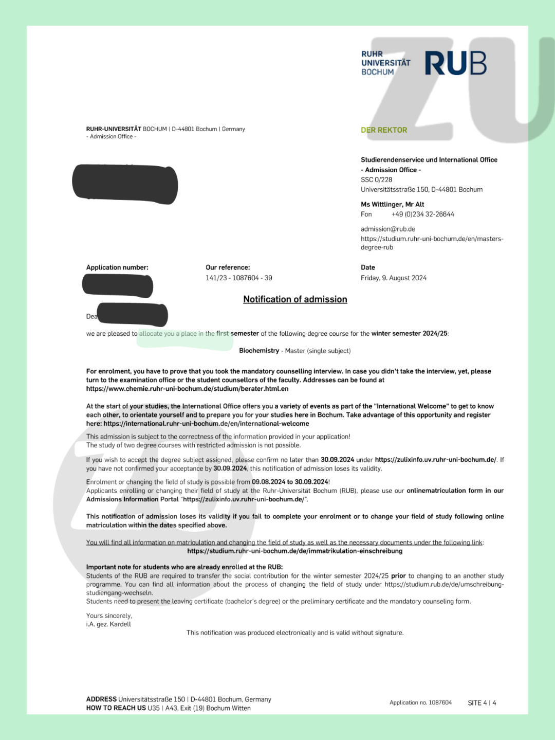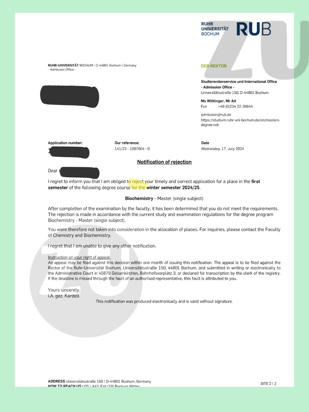 我的学生申请了今年冬季学期波鸿大学的Biochemistry Master,在7月中旬左右的时候收到了拒信。考虑到她的匹配度的确符合学校的相关要求,所以我决定帮她给学校写了一封申述信。最后,在8月9号的时候,学生重新收到了学校发的录取。