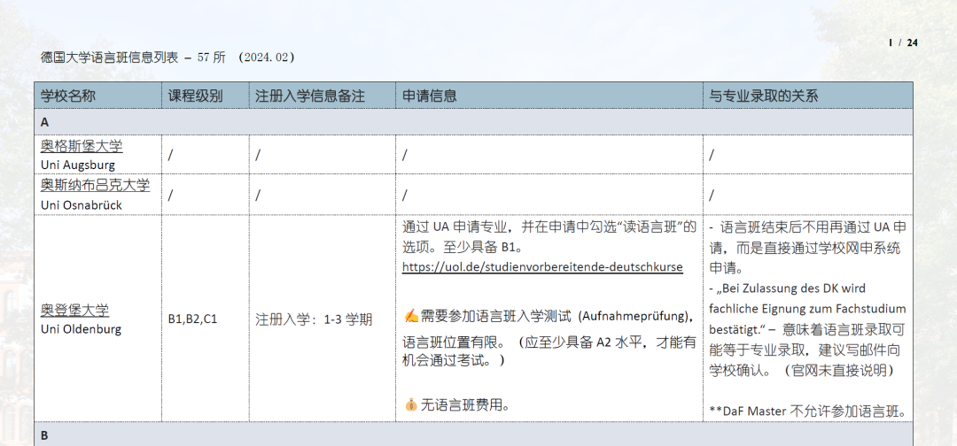 点击这里🛒,可以购买我汇总的最新德国大学语言班汇总信息表格(2024年2月份更新),一共包含57所大学的语言班信息。另外,里面还包含了开设的课程级别和费用、申请要求及流程,以及语言班与专业录取的关系等重要信息。