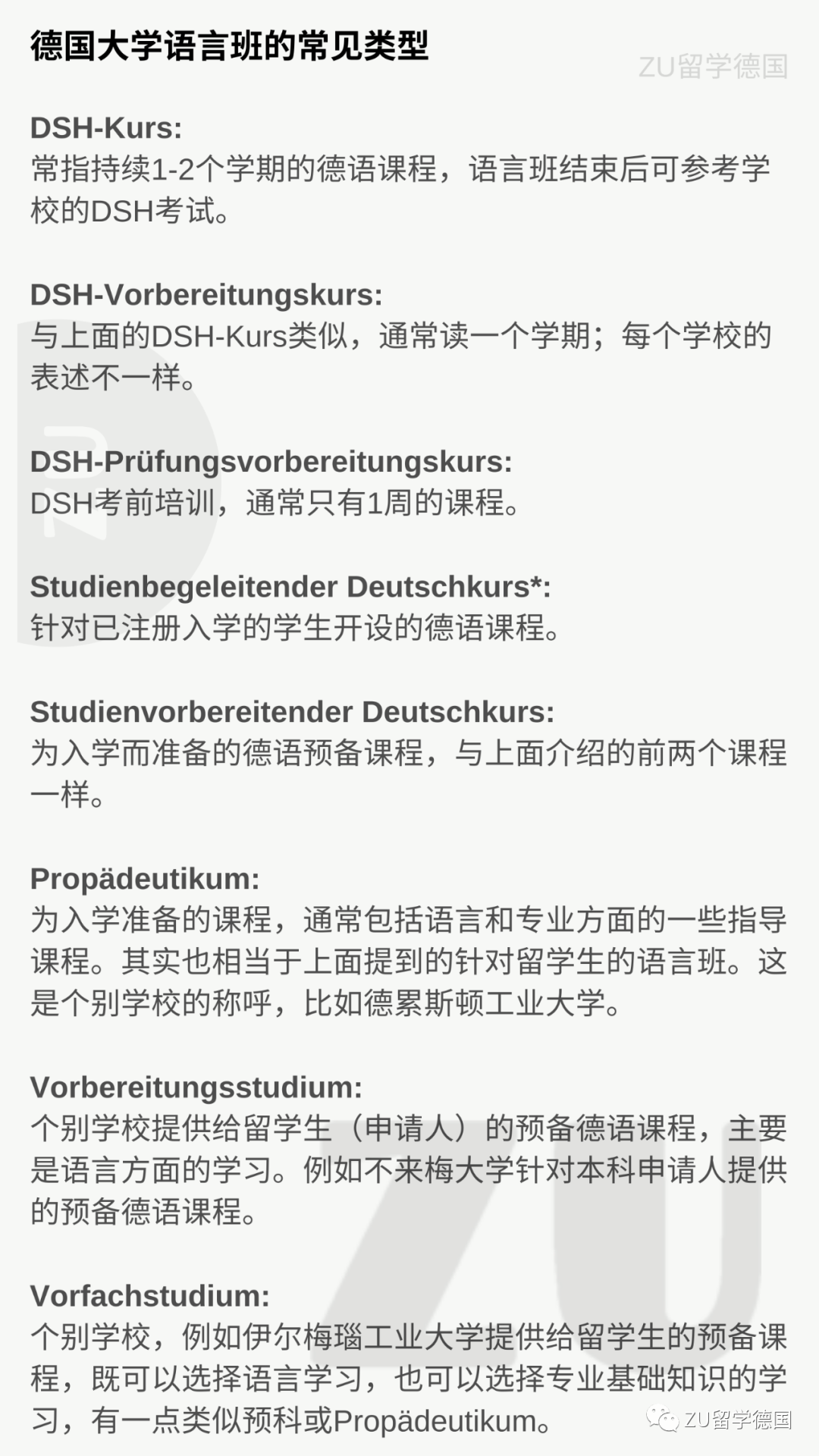 Deutschkurs),该课程通常由学校的国际学生办事处、语言中心或者是学校的预科负责。这类语言课程指的是,学生通过1-2个学期的时间集中学习德语随后参加学校的DSH考试(个别学校是TestDaF),通过语言后可重新申请专业(可以申请本校也可以申请其他学校 )。但并不是所有德国大学都开设面向留学生(申请人)的“预备德语课程”。