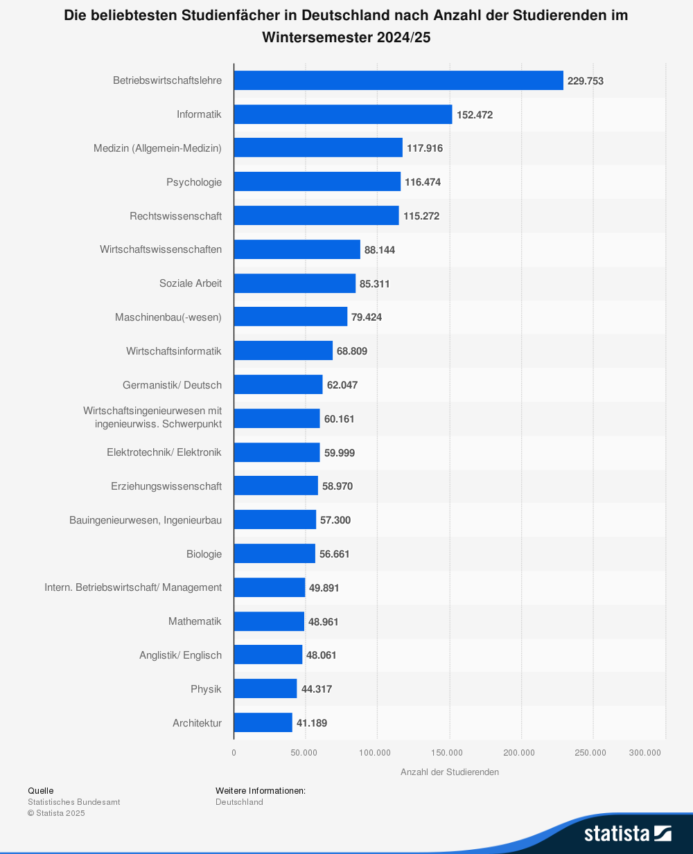 数据显示,约有23万德国学生选择了BWL,使其再次成为最受欢迎的大学专业。无论是男生还是女生,这个专业都以压倒性的优势位居第一,受欢迎程度无人能及。