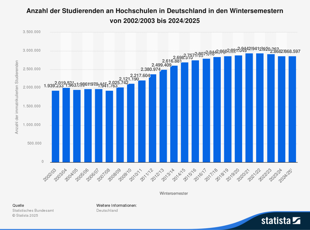 • “学术化”趋势放缓: 有人认为,大学生人数的停滞表明德国社会“学术化”的趋势可能已经达到顶峰。近几年的大学新生入学率也保持在相对稳定的水平。