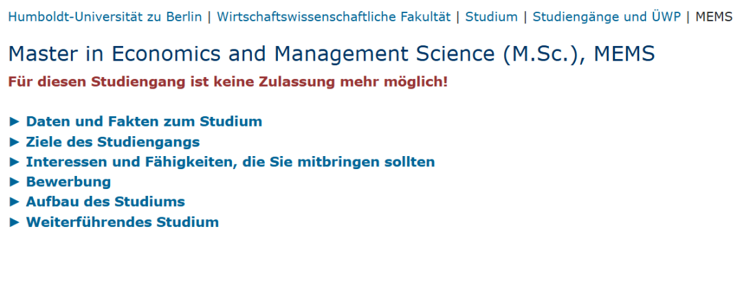 01经济与管理学硕士项目(MEMS)正式停招对于想要柏林洪堡大学(Humboldt-Universität zu Berlin)经济学专业申请的同学来说,一个重要信息值得注意:纯英文授课的经济与管理学硕士专业(Economics and Management Science, M.Sc., MEMS)已正式停止招生。该专业曾是许多同学的首选。其课程设置为四年制(两学年),要求学生完成 120 个 ECTS学分,并在冬季学期(十月)开课。这一变动意味着,未来想要申请的同学需要调整申请策略。 02替代方案:多元化的纯英文硕士项目尽管 MEMS 专业已经停招,但柏林洪堡大学经济学院依然为国际学生提供了同样高质量的纯英文授课硕士课程。学院目前有以下2个热门的纯英文授课硕士项目:M.Sc. in Business Administration (工商管理学硕士)该专业旨在培养学生在企业管理、组织架构、市场营销及金融等领域的专业知识与实践能力。它为学生提供了深入研究商业世界中各种挑战的机会,是未来志向于商业领域的理想选择。M.Sc. in Economics (经济学硕士)该专业专注于宏观经济学、微观经济学和计量经济学等核心经济学领域。课程深入且严谨,适合那些对理论经济学有浓厚兴趣,并希望在学术或研究领域发展的学生。以上两个硕士专业曾经也要求一定德语水平,不过现在已改为纯英文授课专业了。除此之外,还有下面这两个专业的授课语言以英语为主,但是仍然要求具备一定德语水平。M.Sc. in Information Systems (信息系统学硕士)此专业结合了商业和信息技术的知识,旨在培养学生在数字化时代进行数据分析、系统设计和信息管理的能力。请注意,该专业除了英语还要求德语B1水平。M.Sc. in Statistics (统计学硕士)该专业专注于统计学理论与应用,为学生提供在数据分析、建模和研究方面所需的定量技能。请注意,该专业要求英语B1和德语B1水平。 03申请建议由于 MEMS 的停招,其他纯英文授课的硕士专业无疑将成为柏林洪堡大学经济学院最热门的选择。对于有意申请的同学,我建议大家首先深入了解上面介绍的几个专业的具体专业方向,同时结合课程匹配度来选择最符合自身兴趣和职业规划的项目。注意申请要求: 申请截止日期为 5月2日至5月31日。申请人需拥有经济学或相关领域的学士学位,具备扎实的方法论专业知识,并达到欧洲共同语言参考框架C1级别的英语水平(如果没有另外说明语言等级的话),例如TOEFL iBT 95或IELTS 7.0。除此之外,这些专业通常有严格的筛选流程,例如从均分、课程匹配度以及实践经验来综合评估申请人。大家可以在学校官网查看到具体的细节介绍。 /发现更多/