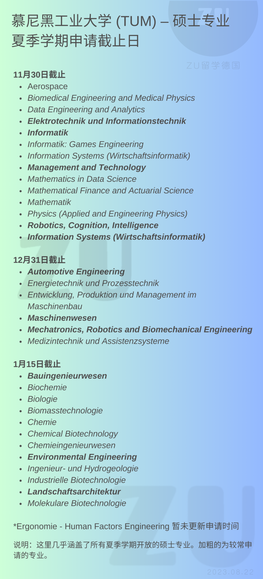 我们知道,慕尼黑工业大学冬季学期的申请时间通常很固定:5月31日截止。不过,夏季学期的申请截止日期则各有不同,11月、12月以及1月中旬截止的情况都有。