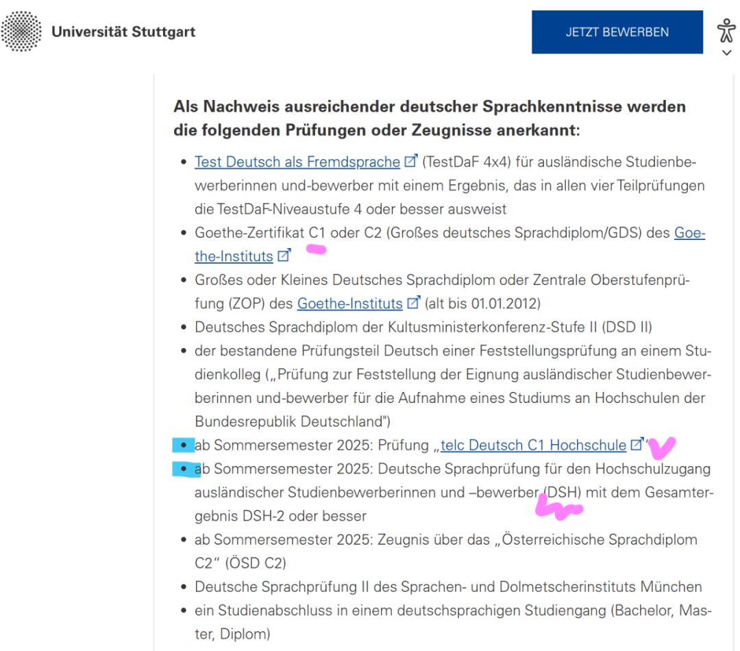 斯图加特大学从2025年夏季学期,也就是从明年4月份入学的学期开始将正式认可telc Deutsch C1 Hochschule考试。