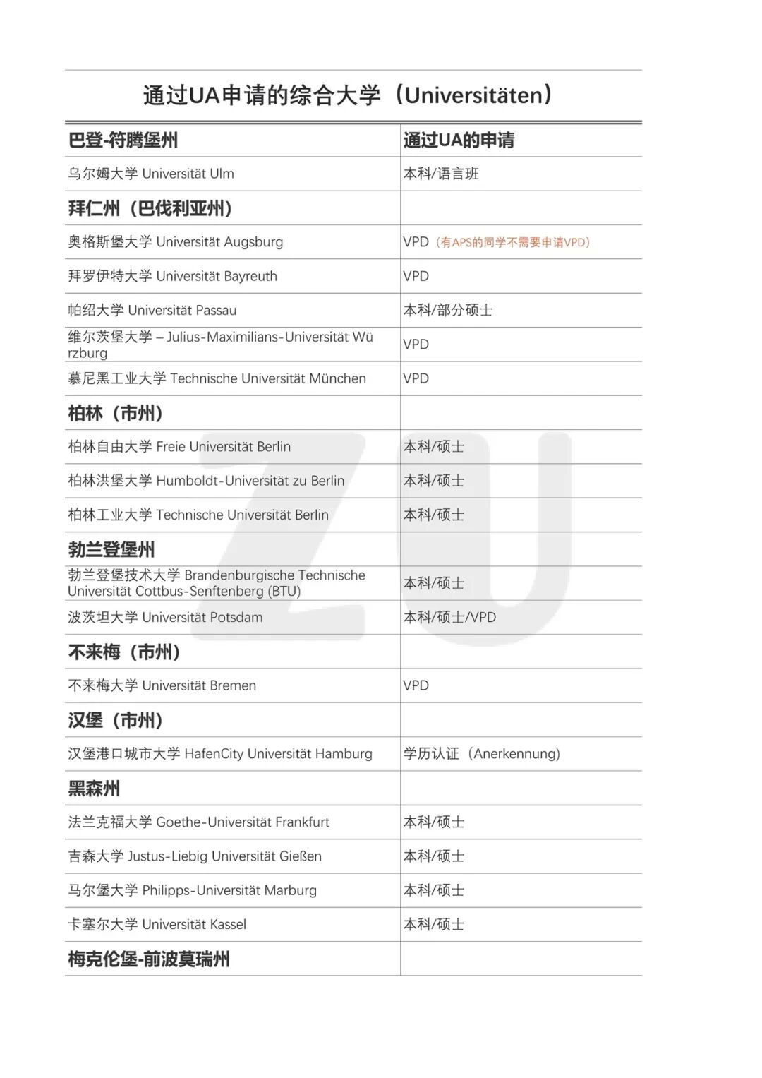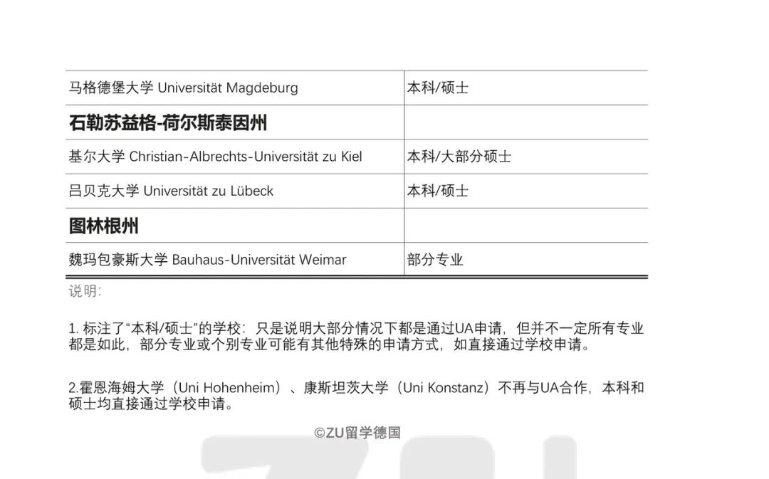 通过uni-assist申请的德国大学作者: ZU / 2025年10月12日 uni-assist的全称为Arbeits- und Servicestelle für Internationale Studienbewerbungen e.V. ;以下简称UA;中文可译为“国际学生申请服务协会”,成立于2003年。 UA由德国高校、德国高校校长联席会(HRK)以及德意志学术交流中心(DAAD)联合设立。据最新的统计,目前有150所德国高校与uni-assist合作。 通过UA申请常见情况有哪些? 通过UA申请,通常有两种情况: 01)#Standard-Verfahren 直接通过UA申请专业:UA收到你的申请后会进行初步审核,包括材料的完整与准确度、是否符合德国高校的入学资格等;审核完毕后,你的申请将转至德国大学,最后由德国大学决定是否发放录取。 02)#VPD Verfahren 通过UA申请VPD文件:只需要通过UA申请VPD文件,拿到VPD后,直接在学校完成申请。 #后台回复“VPD”可以了解更多关于VPD文件的介绍。 Uni Gießen 吉森大学 哪些德国大学通过UA申请? 如上文所说,一共约有150所德国大学与UA合作,但这并不说明,这100多所学校都是通过UA申请,而是有些情况下,个别专业或特殊情况才需要通过UA申请。 这150多所学校里包含许多应用技术大学(FH/HAW/HTW),我们所熟悉的学校其实并不算太多。 我汇总了这些学校,大家可以作为参考。但同时要注意,这些信息随时可能发生变化,因此在申请之前还是要前往学校官网确认一下最好。 通过UA申请需要注意的两点: 1. 通常,不具备德国或非欧盟学历的申请人才需要通过UA申请,具备德国学历的同学,要记得提前了解清楚准确的申请方式。 2. 仍然会出现一些特殊的申请情况,比如个别专业,不管是留学生还是本国学生,都是直接通过学校申请。如柏林洪堡大学的经济与企业管理硕士这个专业就是直接在学校申请。 3. 本科和硕士的申请流程可能有所区别,比如科隆大学的本科是直接在UA申请,而硕士则是先通过UA申请VPD,然后直接向学校申请。 更多关于UA常见申请问题的汇总,也可以点击这里,回顾我之前的总结。 /发现更多/ 哪些德国大学允许德福带3分? TU-9 | 布伦瑞克工业大学哪些专业没有语言条件录取?