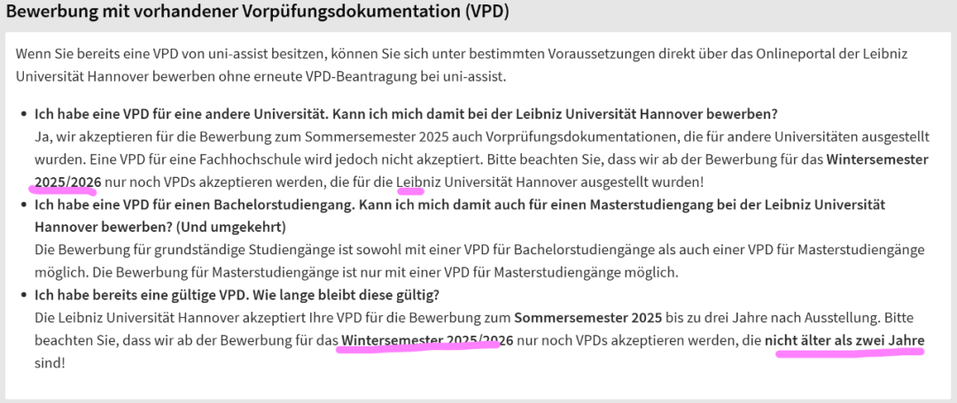 另外,汉诺威大学的VPD有效期是三年,不过从2025年冬季学期开始,VPD的有效期将缩短至两年。