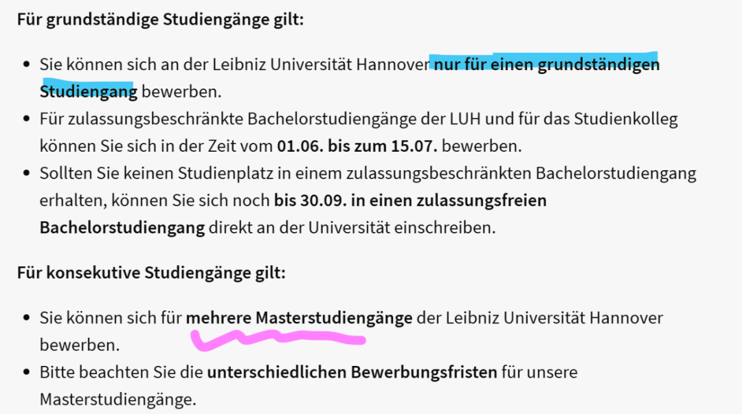 在去年冬季学期开始,汉诺威大学针对本科专业以及部分硕士专业要求🔗VPD(学历预审核证明),也就是你需要提前在🔗uni-assist完成VPD的申请,然后再在学校完成你的专业申请。