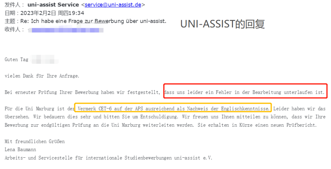 在随后的一两天时间里,我们收到了UA的回复:他们的审核出现了错误,并且说明学生APS证书上注明的“CET6”证书即可证明学校所要求的英语等级(按照学校的要求,高中毕业证书其实也是可以的),因此接下来,他们会将申请转交给学校: