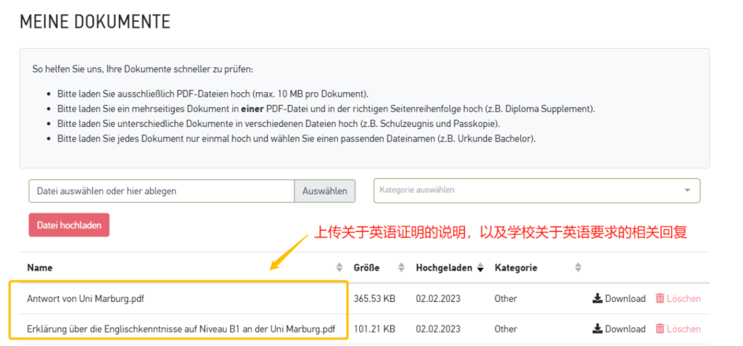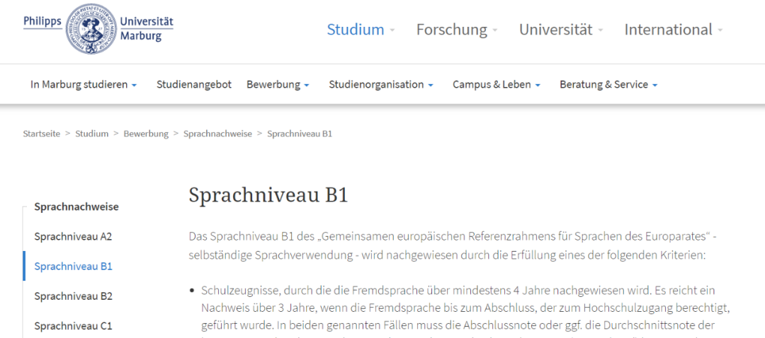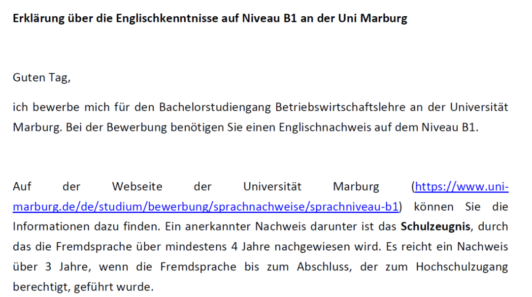 由于我之前已经了解到,该专业尽管要求具备B1等级的英语成绩,但学校并不强制要求提交额外的英语等级证书,申请人可以通过高中毕业证(Schulzeugnis)来证明(至少3年学习过英语,且高考中也包含了英语考试科目);况且,我之前的学生也并没有提交任何英语等级证明,就顺利拿到了录取。