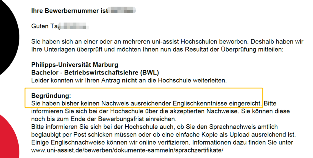 我的一位学生申请了马尔堡大学的BWL本科专业,UA的处理结果为fehlerhaft(缺少英语等级证明),因此他们无法将申请转给学校(如下图):